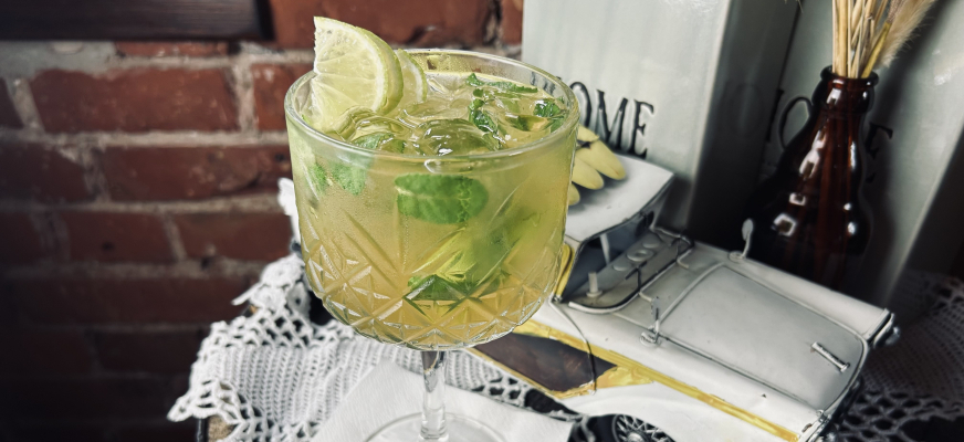Orzeżwiający drink na bazie prosecco free (80ml), mięty, limonki i syropu z kwiatów czarnego bzu
